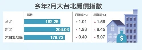 數據顯示,台北市2月份房價指數為162.29,月減1.01%,年增1.56%;新北市則為204.03,月增1.93%,年增8.45%;整體大台北地區房價指數為179.72,月增0.49%,年增5.07%。值得注意的是,台北市中古屋成交多集中在總價2,000萬至3,000萬元,新北市則集中在總價1,000萬至2,500萬元。